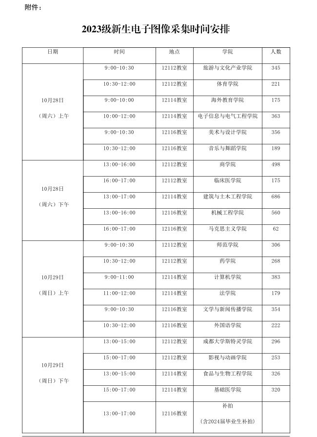 2.原则上应严格按照指定时间段参加电子图像采集,如确因特殊原因无法按时拍摄的同学,可带上二代身份证原件于10月29日(周日)下午13:00-17:00到12116教室进行补拍。