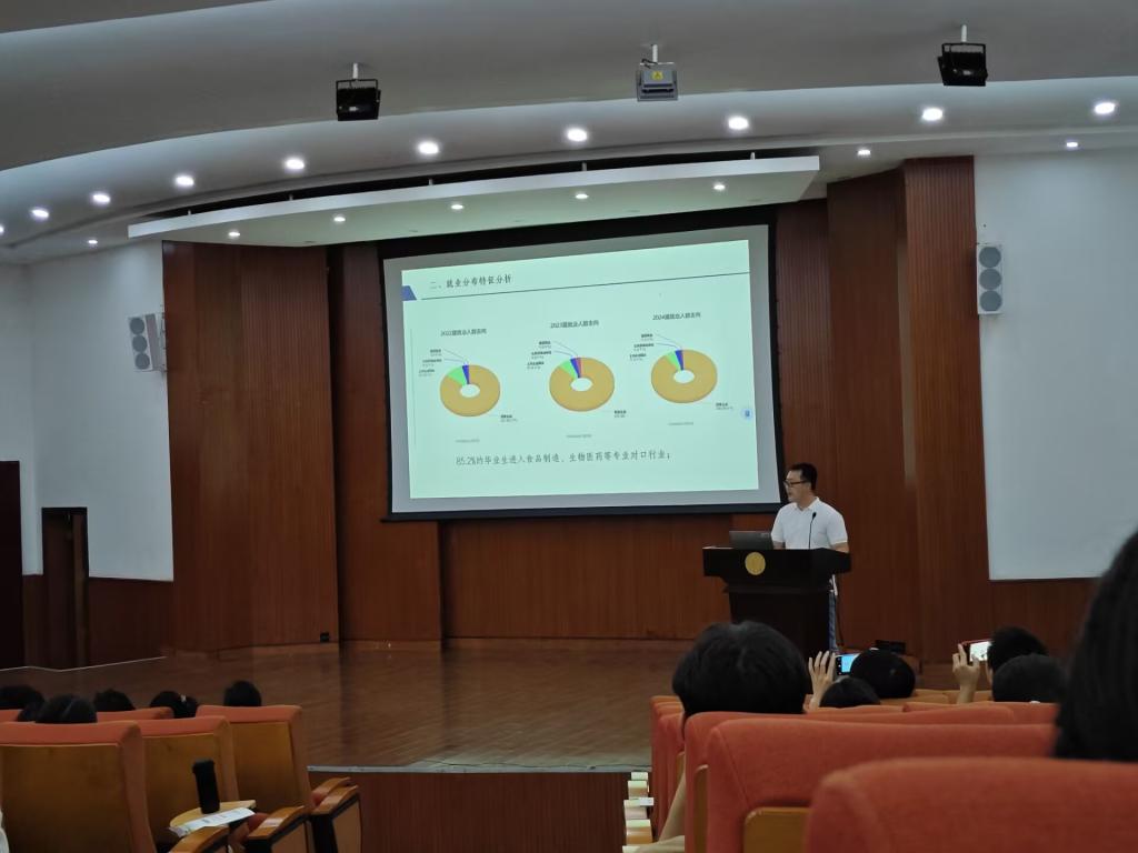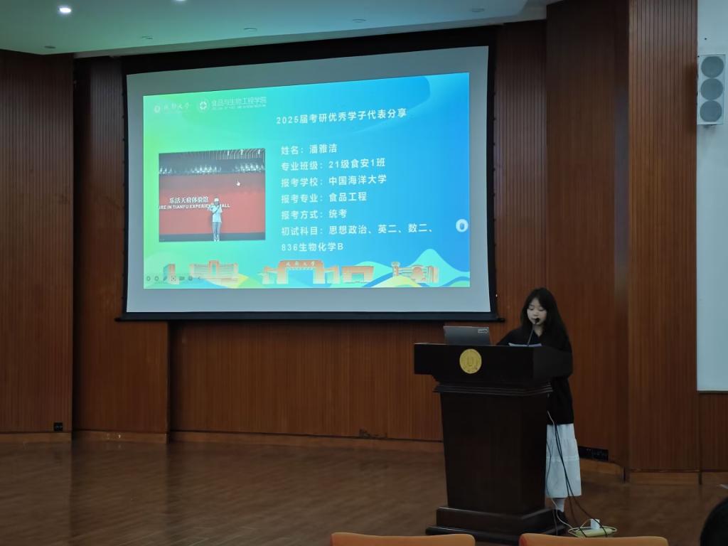 本次动员会特别邀请了2025届两位优秀毕业生代表进行经验分享。2021级食工专业李玲钰同学结合自身求职经历,从行业认知、岗位匹配度、简历优化等方面详细讲解了如何选择适合自己的就业方向。2021级食安专业潘雅洁同学则围绕考研择校策略、复习计划制定、备考心态调整等关键环节,与学弟学妹们分享了实用备考技巧。两位同学的经验分享为在场学生提供了宝贵的就业升学指导。本次也邀请到了校外考研辅导专家就2026年考研形势、院校专业选择策略及科学备考方法等关键问题,与同学们进行了专业指导与互动交流。