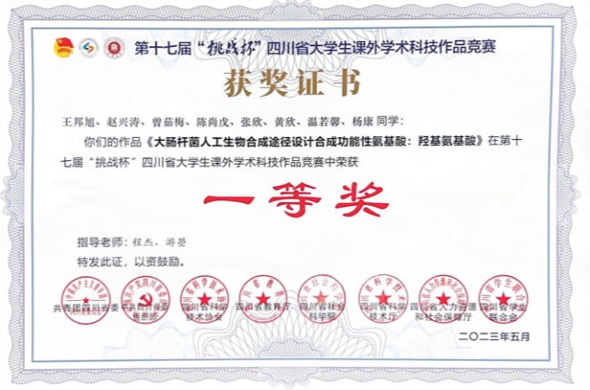 科创筑梦青春,挑战成就梦想。2023年5月,由团省委、省委组织部、省科协、教育厅、省社科院、科技厅、人力资源社会保障厅、省学联主办,成都大学承办的第十七届“挑战杯”四川省大学生课外学术科技作品竞赛终审决赛在成都大学举行。经过激烈角逐,成都大学肉类加工重点实验室大二本科生团队项目《大肠杆菌人工生物合成途径设计合成功能性氨基酸:羟基氨基酸》获一等奖。