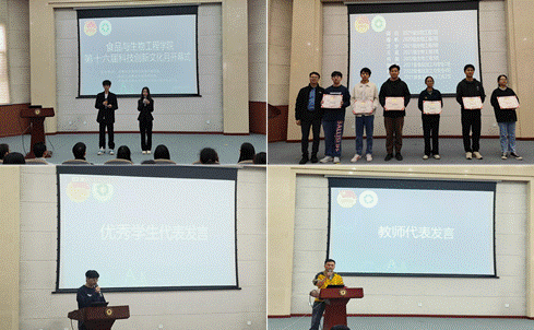 首先,李云成副书记对本学年在科创方面表现突出的同学授予“科创之星”称号。第十七届 “挑战杯”省赛一等奖获得者王邦旭作为优秀学生代表与同学们交流科创经验,鼓励同学们积极参与科创活动,树立创新意识,勇于挑战自我。教师代表刘长英老师发言,表示广大食生学子要脚踏实地,学好专业知识,多向学业导师请教,在学好课堂知识的同时要多走进实验室、生产车间、田间地头,开展创新实践训练,逐步树立创新意识。23级学生带来诗歌朗诵《科技筑梦,创新成长》,展现了新时代青年勇于探索,开拓创新的决心勇气。
