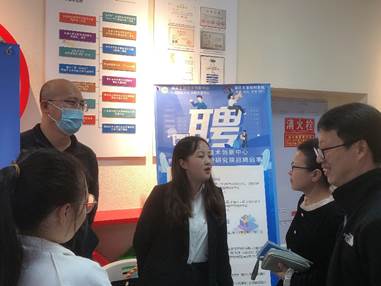 领导来到双选会现场,指导做好双选会各项保障与服务工作,并与用人单位深入沟通交流。