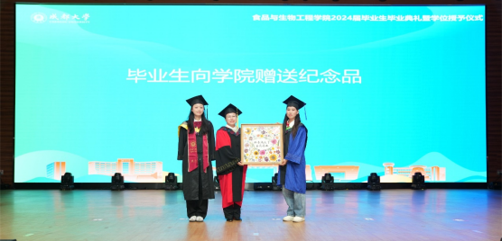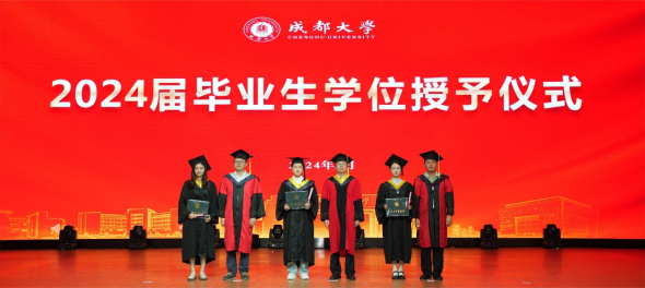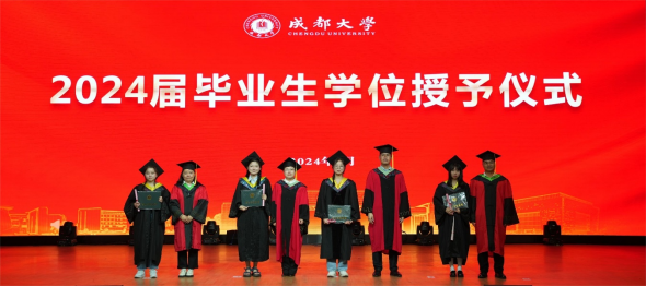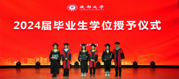 刘达玉、孙雁霞等学位评定委员会成员为全体本科毕业生逐一授位。毕业生们身着整齐的学士服、头戴学士帽,有序走到老师前面,接受授位,为自己的在成都大学的学习、生活画上了圆满的句号,开启崭新的明天