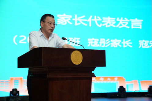 食品科学与工程专业毕业生寇彤家长寇宏俊应邀作为家长代表发言,他提醒即将步入社会的同学们要做到脚踏实地、永怀感恩之心、永远不要停止学习的脚步。