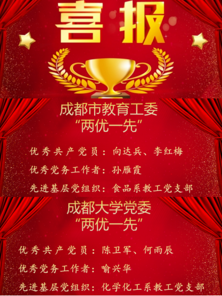 向达兵等6名党员师生、食品系教工党支部等2个基层党组织分别荣获成都市委教育工委、成都大学党委“两优一先”表彰。
