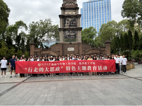 活动尾声,师生们齐聚辛亥秋保路死事纪念碑前。这座高31.85米的方锥形纪念碑,四面镌刻着名家手书的碑文,无声诉说着烈士的牺牲与民族的觉醒 。在庄重的氛围中,师生列队肃立,向纪念碑鞠躬致敬,并合影留念。唐远谋老师说道:“这堂‘行走的大思政’课让历史从书本走向现实,希望同学们将保路精神内化为奋斗动力,在科技报国、产业创新的赛道上跑出青春加速度”; 学生代表2024级化学专业学生罗可译表示:“课本上的历史是平面的,但在这里,每一件文物都在诉说着血性与勇气。我们不仅要铭记,更要以行动回应先辈的期望。”