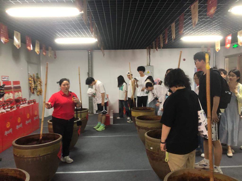 在展示大厅,师生们通过历史实物、图文资料和视频影像,系统了解郫县豆瓣300余年的工艺演变历程,特别关注了“晴天晒、雨天盖”这一国家级非遗技艺的数字化保护成果。现代化生产基地呈现传统工艺与智能制造的深度融合。同学们在老师傅指导下亲手参与“翻、晒、露”传统工序,感受木耙翻醅的力道与节奏,体会非遗匠人“毫厘之间见功夫”的职业精神。在交流座谈环节,范红梅老师围绕三个关键主题进行了深入探讨:首先剖析了企业数字化转型的实施路径,其次解读了行业标准制定的重要意义,最后详细阐述了“郫县豆瓣”作为地理标志产品的文化传承和保护体系。在交流尾声,范老师寄语同学们要把握大学时光提升综合素质,并热情邀请同学们前往企业实习,共同探索职业发展道路。