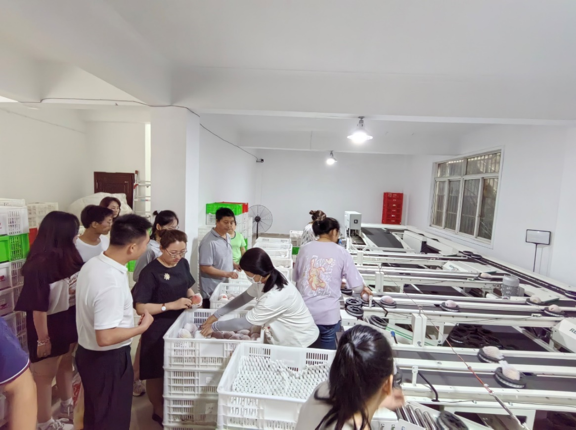 在成都大学与企业共建的水蜜桃示范基地内,王新惠现场指导了本科生、研究生开展水蜜桃品质的快速检测,并在四川盘信农业有限责任公司调研水蜜桃全自动无损分拣线,建议企业根据早、中、晚熟品种进行科学建模,按照单果重、可溶性固形物含量等指标进行分级销售,优质优价,提高销售收入。