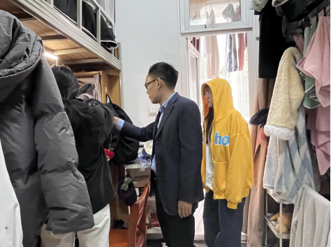 领导与辅导员们深入每一间宿舍,与同学们进行了亲切交流,耐心讲解宿舍安全的重要性,并逐一排查可能存在的安全问题,并对相关同学进行了现场安全教育。