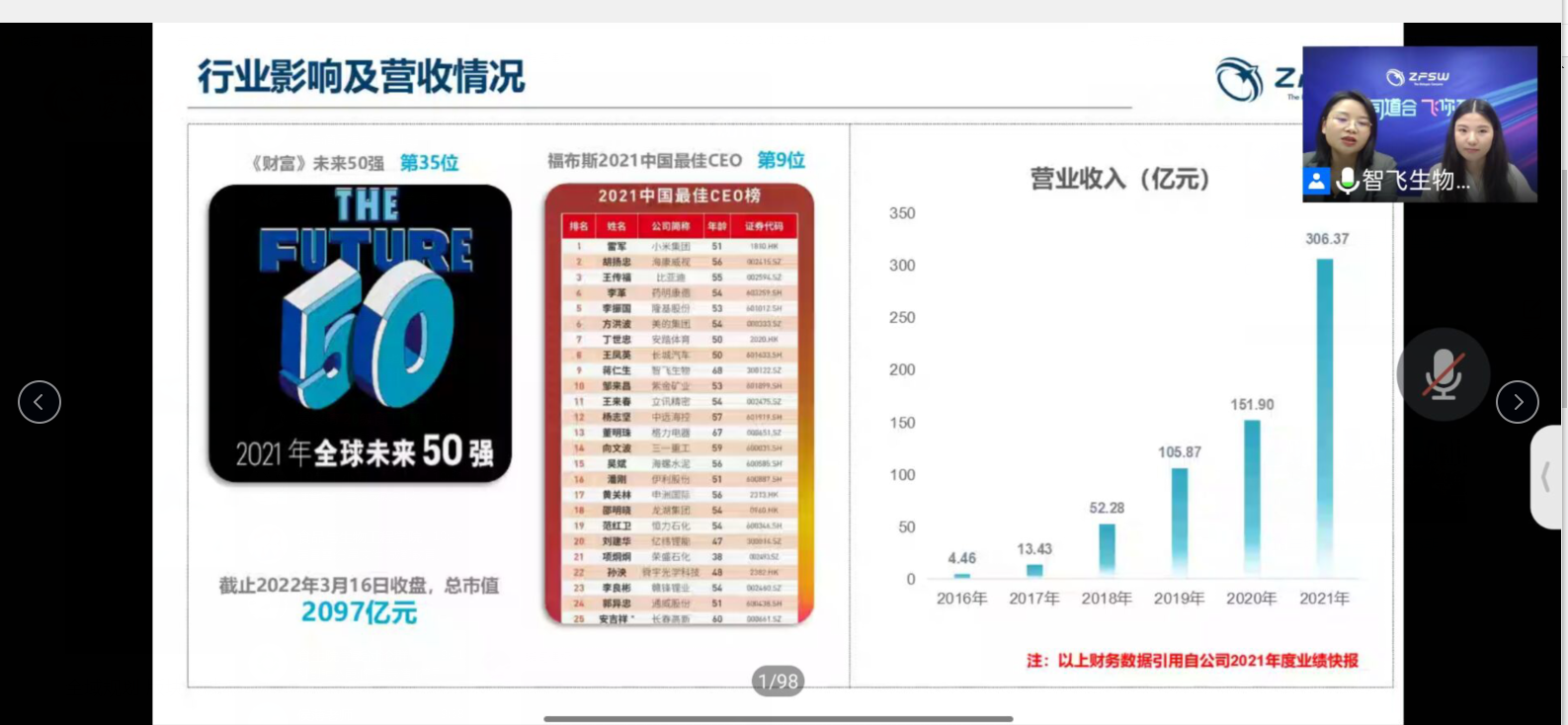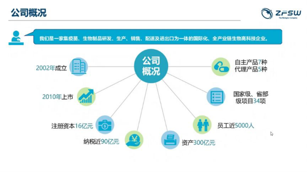 重庆智飞生物制品股份有限公司2002年投入生物制品行业,注册资金16亿元,2021年上半年实现营业收入132亿元,现有资产239亿元,智飞员工4500余人。2010年9月在深交所挂牌上市(股票代码 :300122),成为第一家在创业板上市的民 营疫苗企业,旗下五家全资子公司及两家参股公司,其中北京智飞绿竹生物制药有限公司(简称“智飞绿竹”)及 安徽智飞龙科马生物制药有限公司(简称“智飞龙科马”)为高新技术企业。智飞生物系一家集研发、生产、销售、推广 、配送及进出口为一体的国际化、全产业链高科技生物制药企业,主营的人用 疫苗为国家七大战略性新兴产业,发展前景广阔。